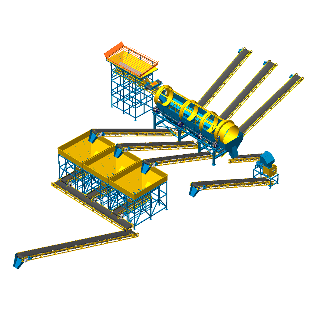 ➥ Baixo Custo Operacional: A alta eficiência do destorroamento autogêneo (por atrito) na Trommel faz com que menos de 10% do material total seja enviado ao triturador. Isso reduz drasticamente o desgaste dos martelos e a frequência de manutenção, prolongando a vida útil dos componentes e minimizando o tempo de inatividade.